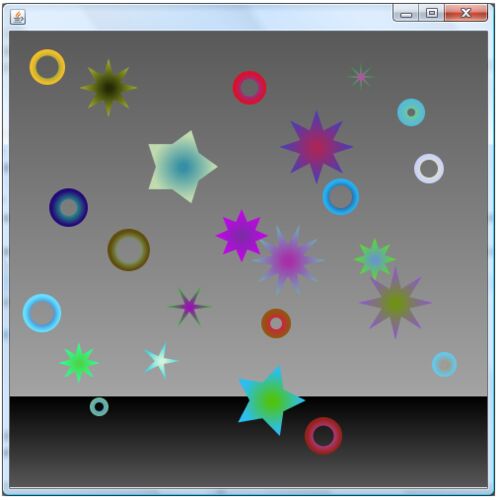 色々と自分でShapeを作れれば、Grapics2Dのfillやdrawを使って、これらのShapeを描画することができる。 Filthy Rich Clientsでは、 Area、Elipse2Dを使ったドーナツ型 GeneratePathを使った星型 などが紹介されている。このカスタムShapeをJRubyで書いてみ…